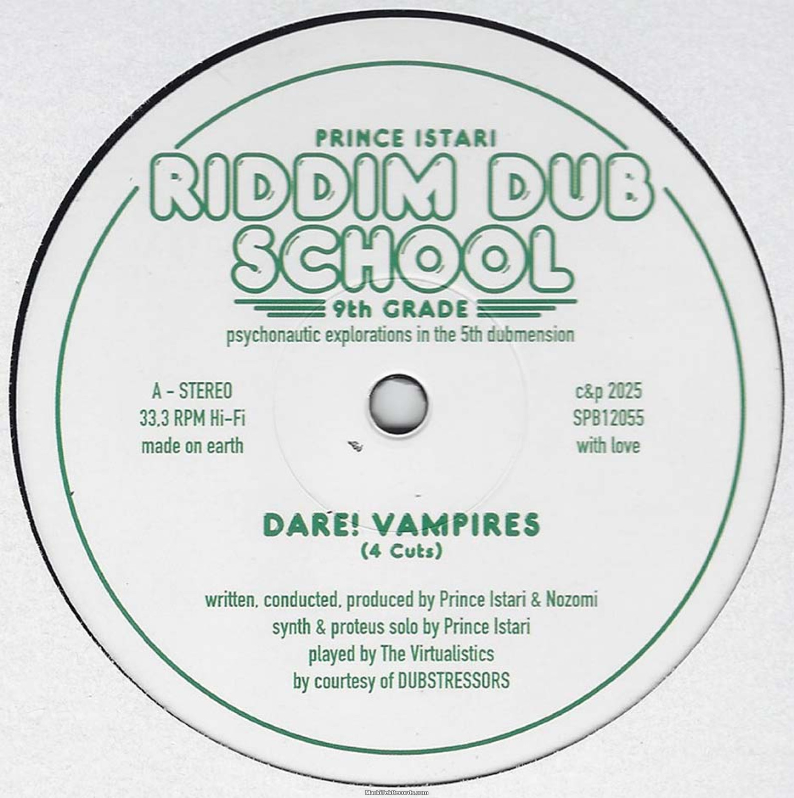 The 9th Riddim Dub School psychonautic explorations in the 5th dubmension. The first side brings us DARE! VAMPIE, a tune made by Prince Istari and Nozomi in courtesy of the Dubstressors. This was done while Prince Istari holds a Dub Science seminar. Here you go with four versions in a strip down dub style. Flipside brings synth line driven stepper SONIC ATTACK OF THE CIRCADAS. that one and the following two versions of DUBMENSIONAL SACNTUARY are both supported by the old Hohner
